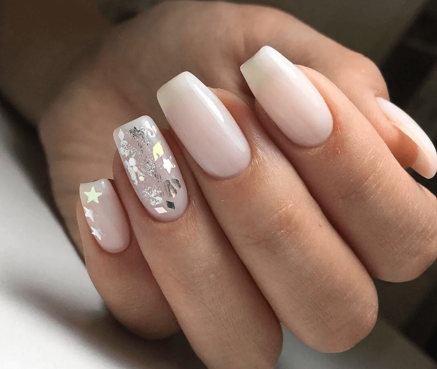 На ногтях квадратной формы нежный дизайн со всевозможными «блестяшками» смотрится не менее впечатляюще. Однако рекомендуется чуть-чуть скруглить углы, ведь в данном случае на первый план выступает мягкая женственность.
