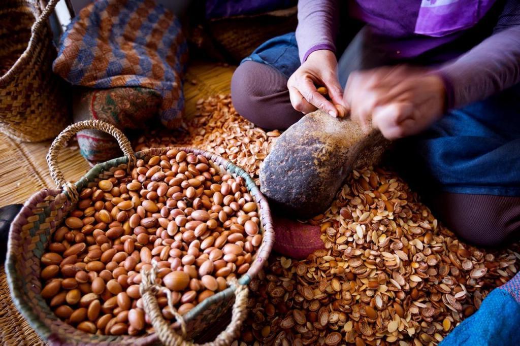 Собранные плоды арганы сушат на солнце, затем очищают от кожуры и удаляют мякоть вручную. Затем остатки арганового ореха нужно расколоть, чтобы извлечь богатое маслом ядро.