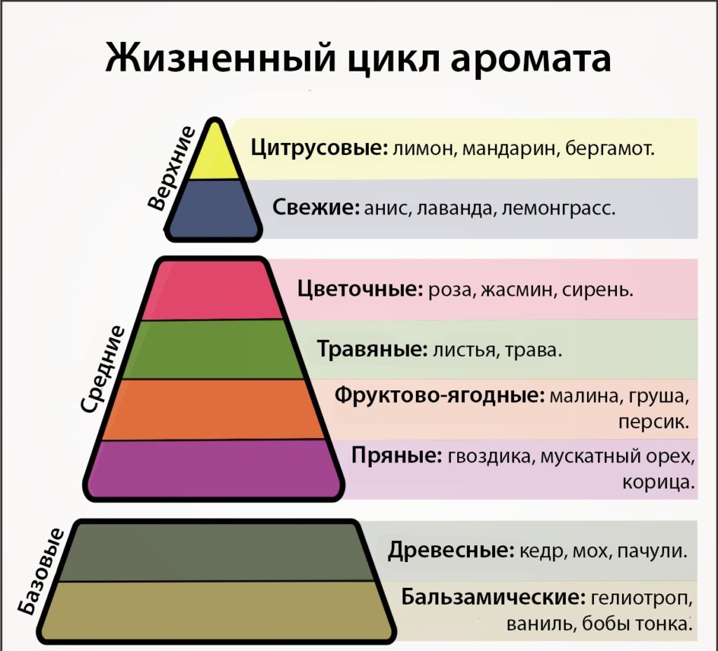 Каждый из трех этапов жизненного цикла аромата содержит отдельные запахи или “ноты”, которые объединяются в то, что вы в итоге чувствуете.