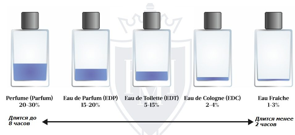 - Eau De Cologne: Состоит из 2%-4% концентраций. Действует около двух часов.